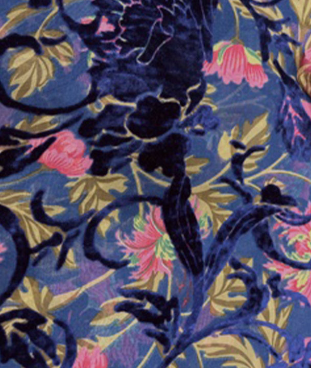 This isn’t just velvet, it’s artistry woven into every inch. Our Burnout Velvet transforms a deep black base into a living canvas, where soft floral patterns bloom in shades of blue, peach, and lavender. Each petal catches the light with a subtle golden sheen, giving the fabric a hand-painted, almost ethereal charm.