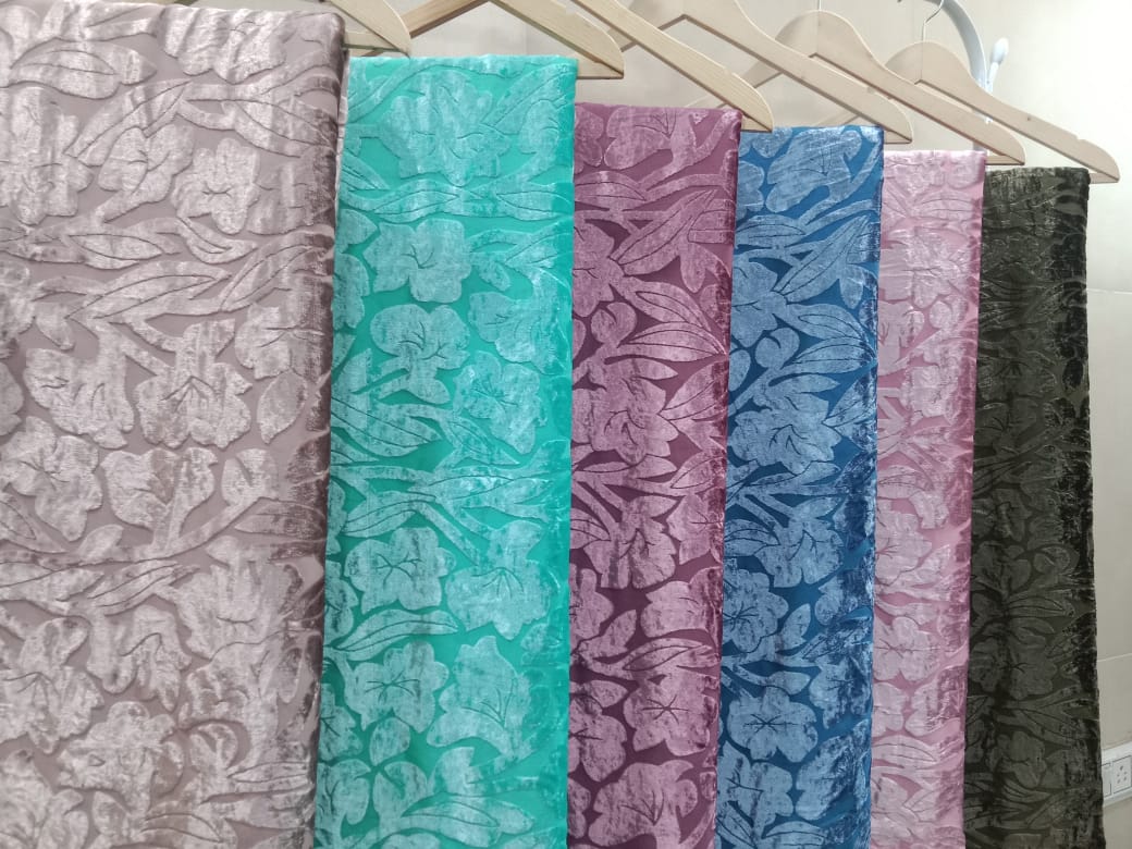 After base velvet is woven, we add burnout (devoré), metallic highlights, or rich plains. Patterns are formed chemically or via yarn choice and finishing.